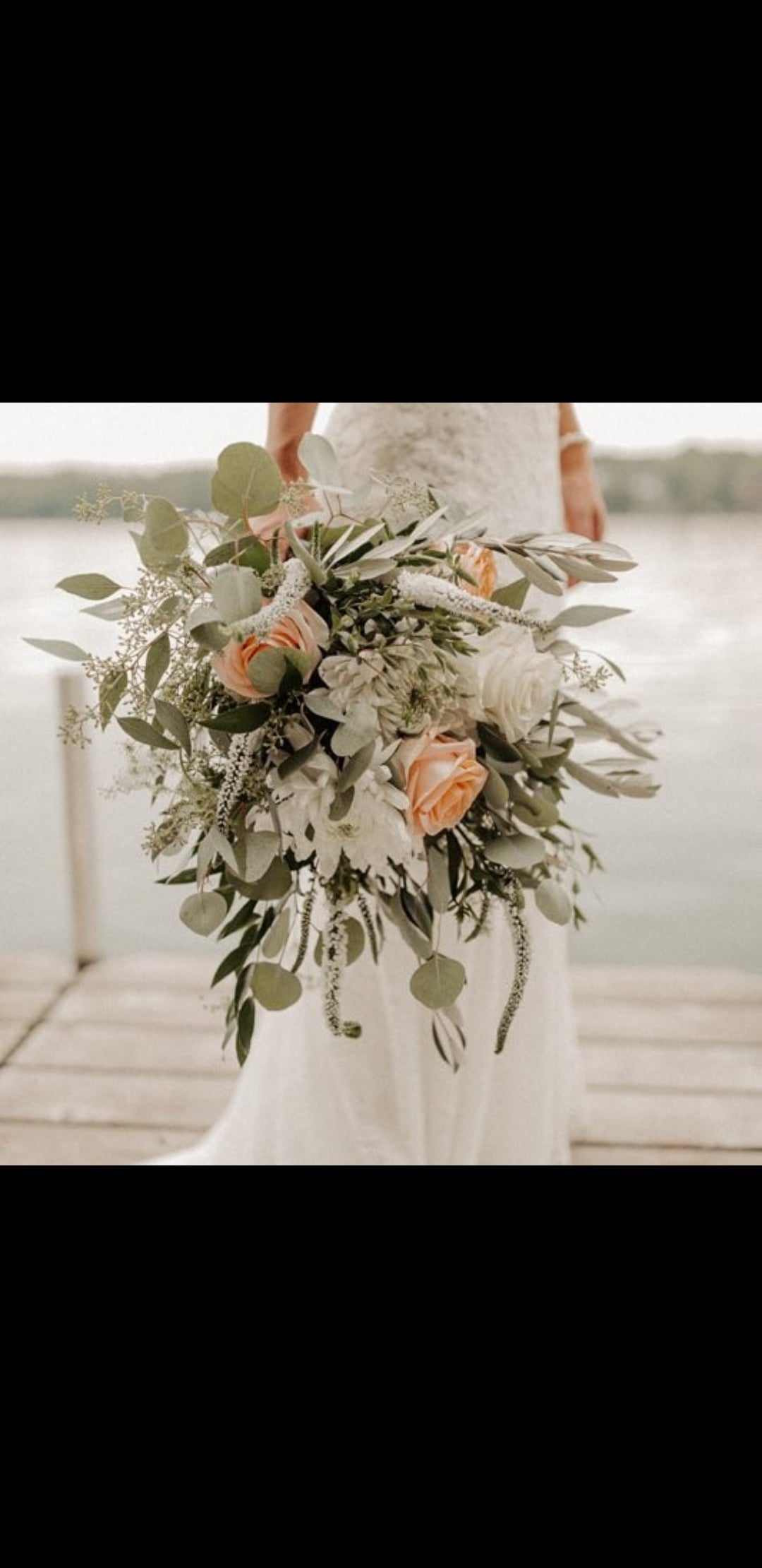 A beautiful lush mix of silver dollar eucalyptus, olive branch, seeded eucalyptus, Italian ruscus, white roses, white veronica and pops of perfect peach roses.